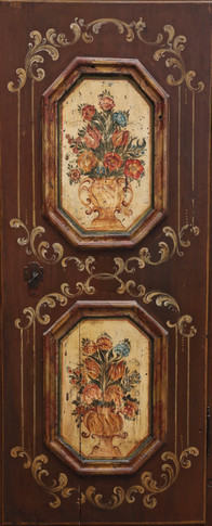 Der Eckschrank aus Weichholz ist reich bemalt in herrlichen brauntönen und voller Symbole des Frühlings. Fronttüre mit zwei abgesetzten Füllungen. Diverse Schwundrisse an Seiten und Türe.